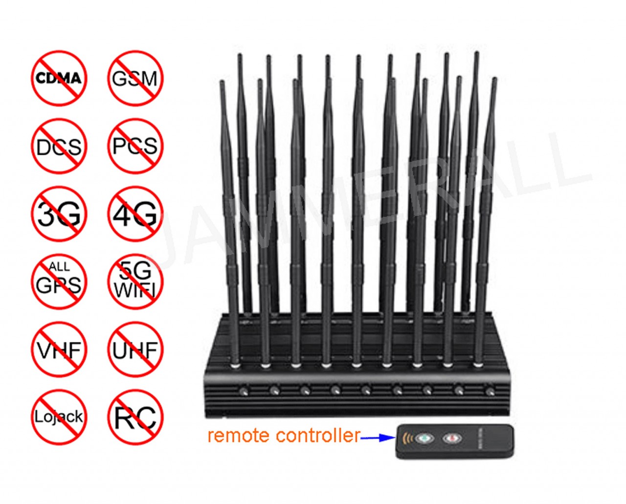 This is the newest model with 18 antennas, which can block all cell phone siganls, all GPS bands, 2.4G 5.2 G 5.8G WiFi, RC signals, VHF, and UHF at the same time. And this Adjustable Desktop Cell Phone Signal 2G/3G/4G + WiFi 2.4G 5.2G 5.8G + All GPS + RC + UHF/VHF Jammer With 18 Antennas is adjustable and built-in 5pcs cooling fan to support non-stop working.